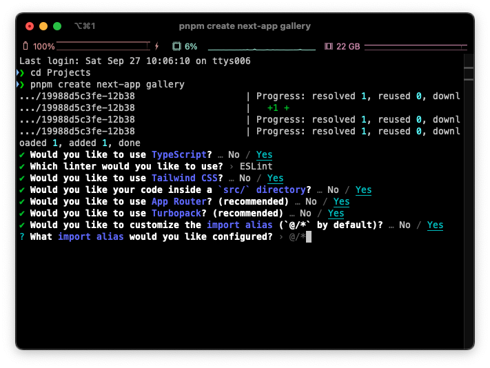 ㅇ Turbopack 쓸거야?(추천) YES (개발속도를 획기적으로 개선 어쩌구 저쩌구... )